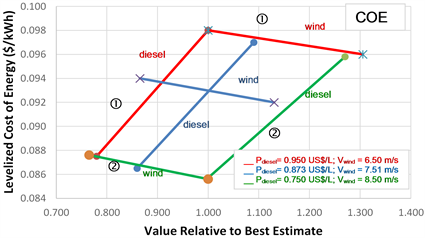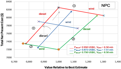 The result of the sensitivity analysis considering a drop in the diesel price to 0.75 $/L and an increase in the wind speed (8.5 m/s) can also be seen in Figure 6 and Figure 7 (green lines). The analysis of these variations will be presented in the next section. Note that with the diesel price becoming higher (i.e. blue line shifted to the left side until it rides the red line) the value relative to the best estimate worsens (decreases) which increases the diesel NPC . A similar behaviour occurs in the case of the wind generation NPC.
