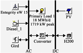Table 2 shows how the generation of the different components behaves in cumulative terms. In this case, a greater contribution of power production by the utility, followed by the wind and diesel systems, can be observed. Although the diesel generator has a higher capacity than the wind turbine, the software gives priority to the contribution of the renewable sources.