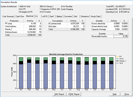 For this (base case) condition, the NPC = $ 6,499,677; the LCOE = 0.153 $/kWh, and the cost of operation = 872,841 $/year.