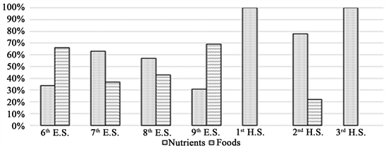It was possible to observe Elementary School students presented more difficulties in mentioning nutrients when compared to High School students. Furthermore, in sixth and ninth grades groups there was an expressive low performance in distinguishing nutrients from food. Based on the results, we judged necessary to find if the nutrients listed by the groups agreed with those presented in each of the food pyramid levels. In Figure 2 the averages percentages for each nutrient listed by the groups are presented.