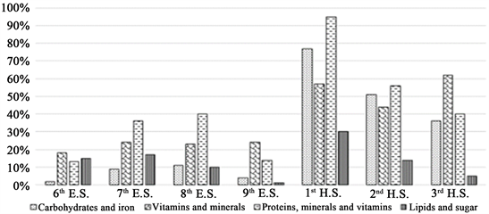 In level 1, the nutrients listed by students were carbohydrates and iron. We observe almost 80% of High School students from the first grade pointed these nutrients, by contrast, Elementary School students listed names of food from the pyramid, for example, bread and pasta.