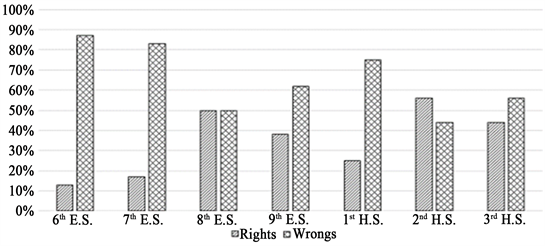 Comparing the process of identifying minerals to the one identifying vitamins, we can notice by Figure 3 and Figure 4 that students had a better performance when they had to identify minerals. However, according to Figure 4, students tend to make mistakes when relating minerals to other nutrients, for an example, the most listed as minerals were lipids, carbohydrates and proteins. A group from the sixth grade (Elementary School) listed fruits and vegetables instead of minerals or vitamins, but the other students were able to distinguish, in this question, food from nutrients, listing vitamins and minerals as expected from them. The most listed in every group was calcium, showing how students can recognize this mineral easily. For the second question, 52% of students listed minerals correctly, and 48% related minerals to other nutrients incorrectly. In Figure 5 we present percentages of the indications right and wrong identifications of the highest in calories nutrition facts tables (C and D).