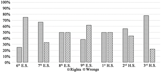 In the first question, the groups of students had to point which nutrients they could find in each level of the food pyramid provided, however, many students identified not only nutrients, but also different examples of food (Figure 1). Based on the number of students per grade (from 6th grade of Elementary School to 3rd grade of High School), it was checked how many students listed names of food and how many referred to the nutrient, for example, some students answered “meat” when asked about an example of nutrient. Given the number of responses, the average percentage of indications in each class was taken, according to the chart.