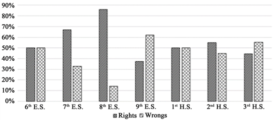According to the analysis, 46% of Elementary School students mentioned names of nutrients and 54% names of food. For High School students, 93% named nutrients and 7% names of food from the food pyramid, such as: pasta, cake, meat, fish, etc. The data is compatible with other studies cited above, in which students are not able to distinguish food from nutrients.