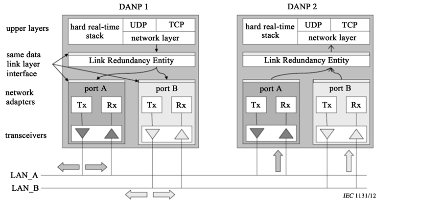 As described in the IEC 62439-3 [2] , to achieve the redundancy, the PRP nodes are connected to two independent similar-topology Local Area Networks (IST-LANs), i.e. L_A and L_B, through two independent physical ports as doubly attached node obeying to PRP (DANP). Those two ports share the same MAC address but operate in parallel and are attached to the same upper layers of the communication stack through the link redundancy entity (LRE) embedded in the Data Link Layer, as shown in Figure 1. The LRE ensures that the upper layers are unaware of and unaffected by the redundancy.