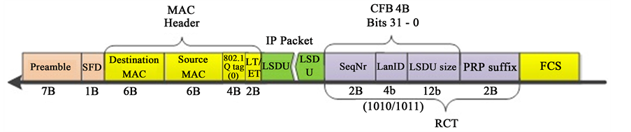 Next, the LRE duplicates the data frame, appends a redundancy check trailer (RCT) to each of the frames, which contains the PRP specific information, including a sequence number, LanID, frame size, and PRP suffix (as shown in Figure 2). The two RCTs are identical except for the LanIDs, i.e., “1010” for L_A and “1011” for L_B. Then the two frames are sent through two physical ports to L_A and L_B separately.
