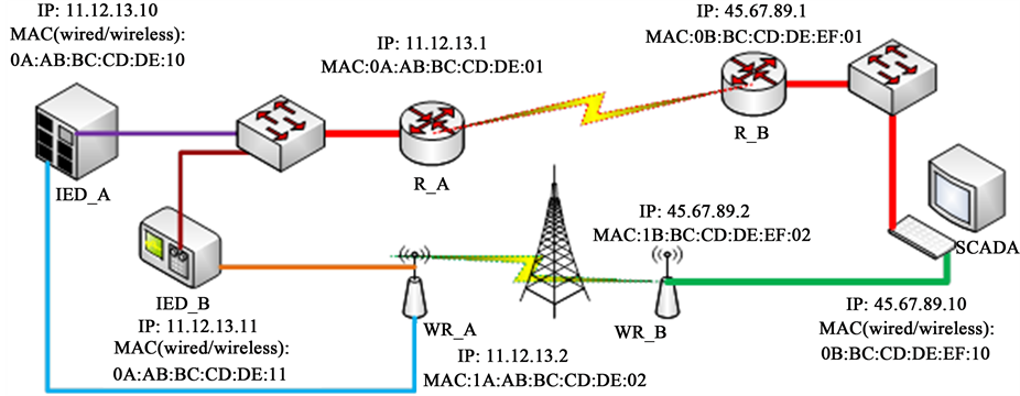 For a network shown in Figure 3, two IEDs IED_A and IED_B are connected to the WAN through two routers and two paths of wired and wireless WANs. The wired path includes a switch and a router R_A, while the wireless path only includes a wireless router WR_A. The SCADA system also is connected by a wired path, i.e., router R_B and a Layer 2 switch, and a wireless path through the wireless router SR_B. (In case of single router connection, the process is similar. However, it will cause single point failure problem, therefore is not preferred and not elaborated.)