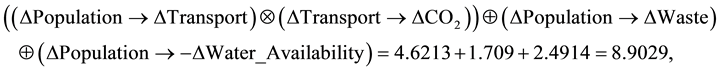 This situation can happen in the reality, because, as we already know, the population growth contributes to the increment of CO2 production without passing, necessarily, through the transport. Thus in this case two paths point to the same node (CO2, in this case). Thereby, the final representation is presented by Equation (6) as follows: