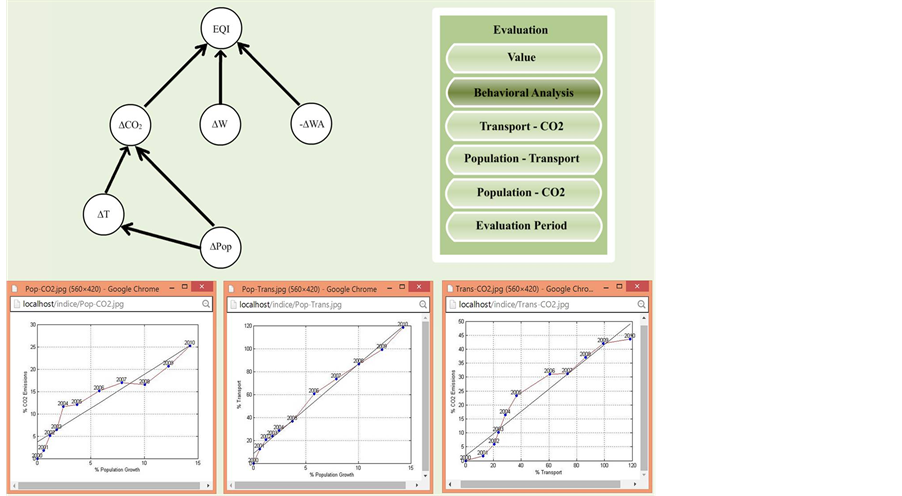 Obviously, certain users, such as the decision makers, could be interested in knowing the cause of this value, by looking at detail what or which relations have influenced, the most or the least, the final result. The next section deals with a computer interface that is useful to analyze how the behaviors of individual indicators, or the relations between them, have participated in the determination of the final value. The whole graph can be tracked relation by relation or node by node by displaying the graphics corresponding to the relations of the graph and/or the variables of the nodes versus time (10 years).
