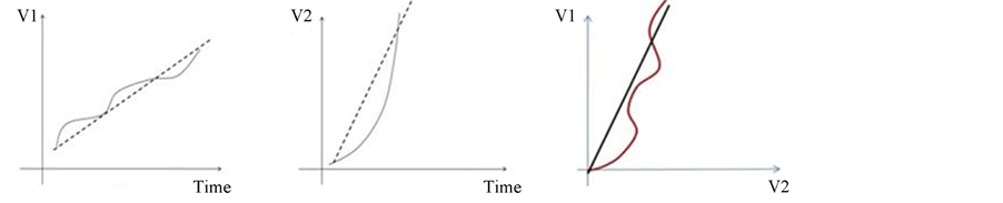 We illustrate through an example how it works. Figure 2(a) and Figure 2(b) show two graphics of indicators (V1 and V2) versus time. Meanwhile, Figure 2(c) illustrates the relation of V1 with V2.