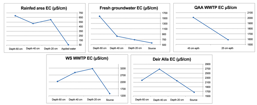 Rainwater increases in salinity during infiltration with increasing depth. The increase in the concentrations of the different parameters is a direct result of dissolution of soil minerals and evaporation from the topsoil. In the freshwater of the springs used for irrigation in the Wadi as-Sir plant nursery, the increase in EC and other parameters with depth can be attributed to the evaporation and slight dissolution of soil minerals. In the Wadi as-Sir WWTP, on comparing the chemistry of the applied water and the infiltrated water at depths of 20, 40 and 60 cm, it was found that the EC increased at the depth of 20 cm, and then it decreased at 40 cm, and further at 60 cm. The water salinity is therefore at its highest at the depth of 20 cm and it decreases gradually with depth. The collection of samples from different depths extended over a time period with an average of around 72 hours after irrigation. Therefore, the first two depths 20 and 40