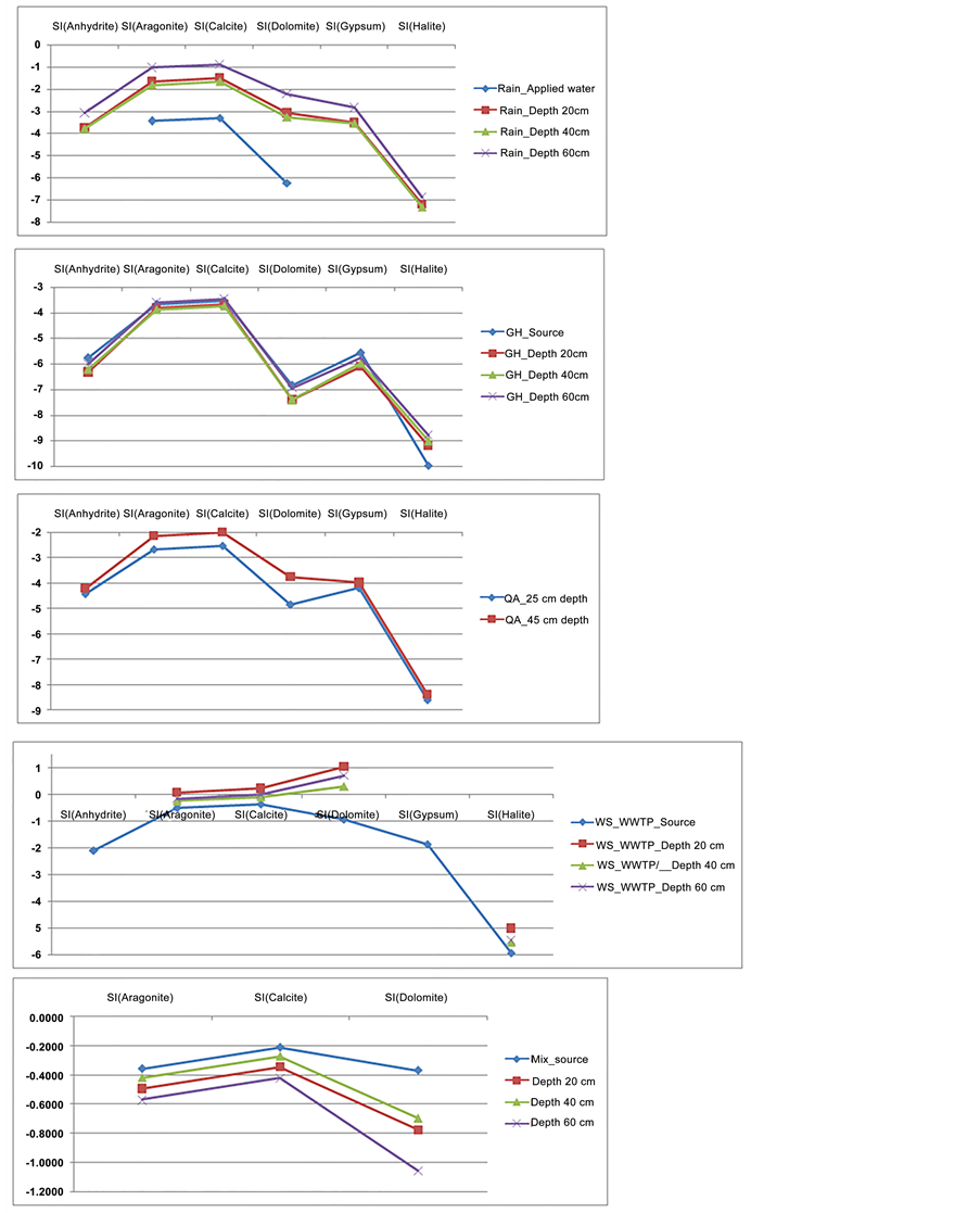 movement. The fresh groundwater site shows that the water is undersaturated with respect to all minerals anhydrite, aragonite, calcite, dolomite, gypsum and halite which reflect the ability of this water to dissolve those minerals. The changes in the SI with depth are small and reflect two mechanisms, which work in two different directions: 1) decreasing deficit of SI (less negative SI values) as a result of additional water rock interactions and 2) common ion effect which cause increasing deficit of SI (more negative SI values). The infiltrated water, even at the depth of 60 cm, is capable of dissolving not only gypsum and halides, but also carbonates such as dolomite and calcite, which are the main soil constituents. For the treated wastewater sites, in the QAA WWTP, SI showed increasing saturation with depth, which means that water dissolves salts from soil and becomes more concentrated in the infiltrated water by depth. Moreover; for the WS WWTP, SI showed wide variations: at the source, the water was undersaturated with regard to all salts; at the depth of 20 cm and below, it became oversaturated with aragonite, calcite and dolomite and able to precipitate them and change soil salinity. For the mixture between fresh and treated wastewater, SI showed that the water dissolves salts with depth, and those salts become more concentrated, but the water is still undersaturated and it is able to dissolve more salts from the soil. Figure 2 shows the different saturation indices for different locations.