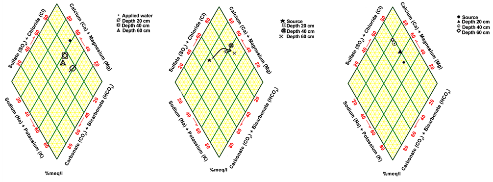 As mentioned before, different sites were studied in this work according to the source water quality; in the rain-fed location suction cups were installed at depths of 20, 40 and 60 cm into the soil to study the changes in the physicochemical parameters during infiltration and water rock interactions on the infiltrated rainwater chemistry [2] . When comparing the composition of the applied water with that of the soil water at different depths, it can be noticed that the EC increased by approximately 600%, from 60 micro siemens per centimeter (“μs/ cm”) at the surface (source water) up to about 688 μs/cm at the 60 cm depth. The increase can be attributed to water evaporation and dissolution of soil minerals. For the fresh groundwater type, when comparing the chemistry of the source water and infiltrated water at different depths, it was found that the EC increased by approximately 200%, from 576 μs/cm in the source water at the surface up to 1560 μs/cm at the depth of 60 cm. Figure 1 and Figure 2 show that the variations of concentrations of chemical parameters were compatible with