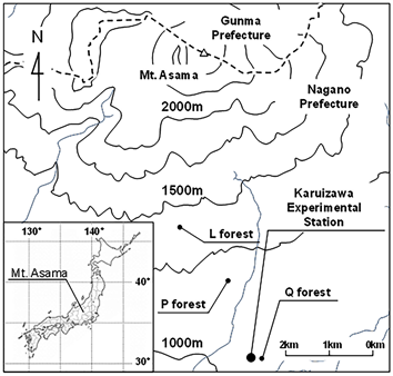 The three study sites, which were dominated by Q. serrata (Q forest), L. kaempferi (L forest) and P. densiflora (P forest), were located on the middle slopes of Mt. Asama within 3 km of the Karuizawa Seminar House (36˚20'N, 138˚33'E, at 1004 m a.s.l.) (Figure 1). In 2012, the ages of the dominant species were about 40 years for Q and P forests, and 45 years in L forest. Between 1977 and 2007, the annual mean air temperature was 7.9˚C and annual precipitation was 1198 mm (Karuizawa Weather Station of the Japan Meteorological Agency). This region is categorized as a cool temperate zone.