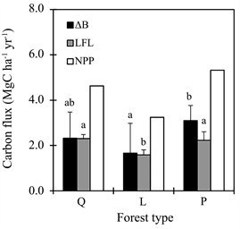 Figure 2. Variation in annual growth of biomass (ΔB), amount of litter fall (LF) and net primary production (NPP) among the three forest types from March 2012 to March 2013. Q, L and P forest represent study plots dominated by Quercus serrata, Larix kaempferi and Pinus densiflora, respectively. Error bars indicate standard deviation. Different letters indicate statistically significant differences (p < 0.05).
