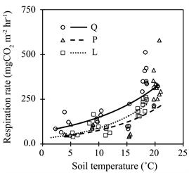 Rh in Q forest tended to be higher in L and P forest in each month. There was a significant difference with L forest in September and in P forest in May and October, respectively (Table 4). Rh increased exponentially with soil temperature in each forest (Figure 3). Across the full range of soil temperature, Rh was relatively higher in Q forest than others. However, Rh in L forest was relatively higher than that in P forest especially at higher temperatures.
