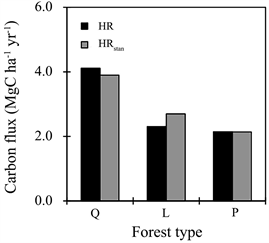 The annual HR in Q forest, which was estimated from the relational equations (Figure 3) and hourly soil temperature (Table 2), was 1.8 and 2.0 times higher than those in L and P forest, respectively (Figure 4). Annual HRstan was also higher in Q forest than others (1.4 and 1.9 times that of L and P forest). The differences in HRstan among the forest types were slightly smaller than those of HR.
