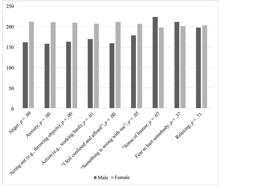 Females and males emotional reactions to the homicidal fantasies differed in several ways. Females reported stronger negative emotions (anger, anxiety, acting out, and action) than males. Males tended to react with a sense of humor more than females (comparison approached the significance level). The results are presented in Figure 1.