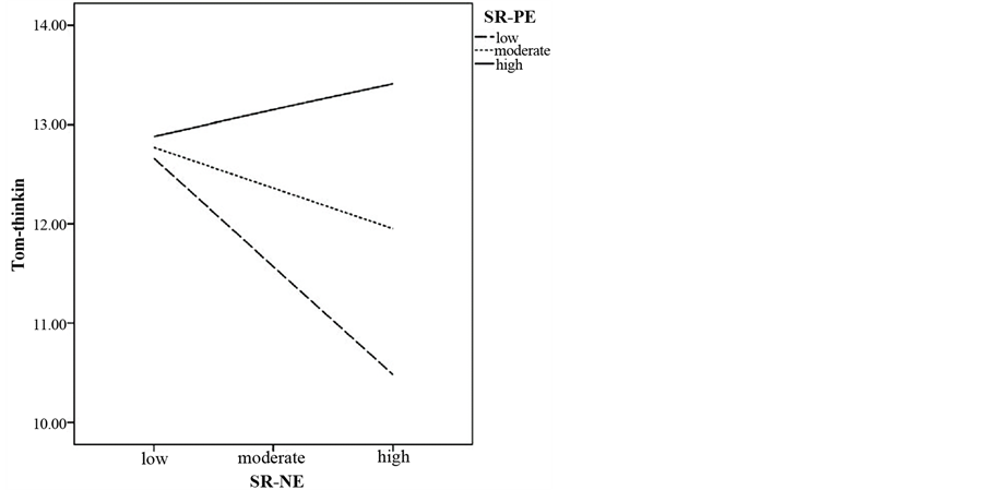 Figure 1. Association between children’s ToMI-thinking and maternal SR-NE as a function of high, moderate, and low levels of maternal SR-PE.