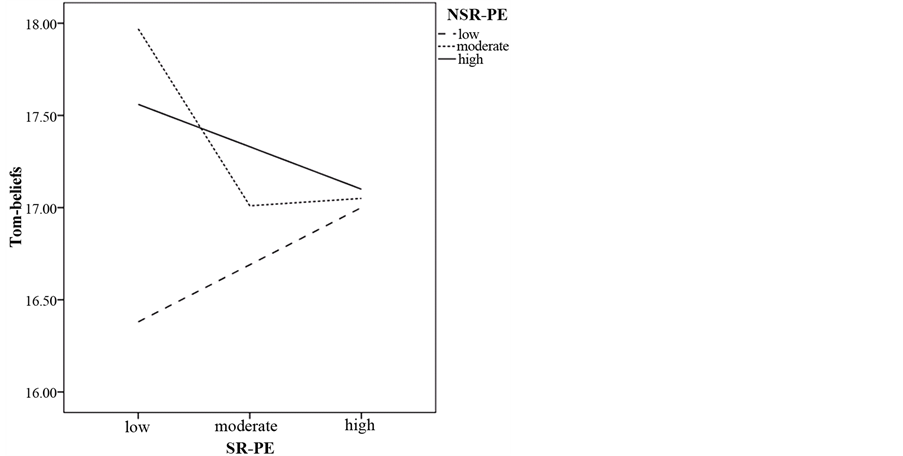 Figure 2. Association between children’s ToMI-beliefs and paternal SR- PE as a function of high, moderate, and low levels of paternal NSR-PE.
