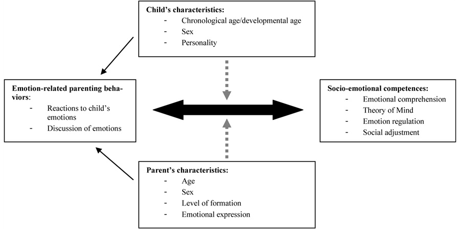 Our heuristic model suggests the importance of testing similar hypotheses with the component of parental conversations about emotions as an independent variable, but also, the need to conduct longitudinal studies to examine the bidirectional associations between parental emotion-related behavior and children’s emotional development in taking into account the potential moderator effect of parents’ and children’s characteristics. In our model, we consider the degree of parents’ emotional expression as a parental characteristic and not as a fully-fledged component of socialization behaviors. Indeed, parental expressivity is generally regarded as a component of parenting style, rather than a specific parenting practice. This variable therefore creates an emotional climate that may moderate the relation between parenting practice and children’s development (Darling & Steinberg, 1993; Morris et al., 2007) .