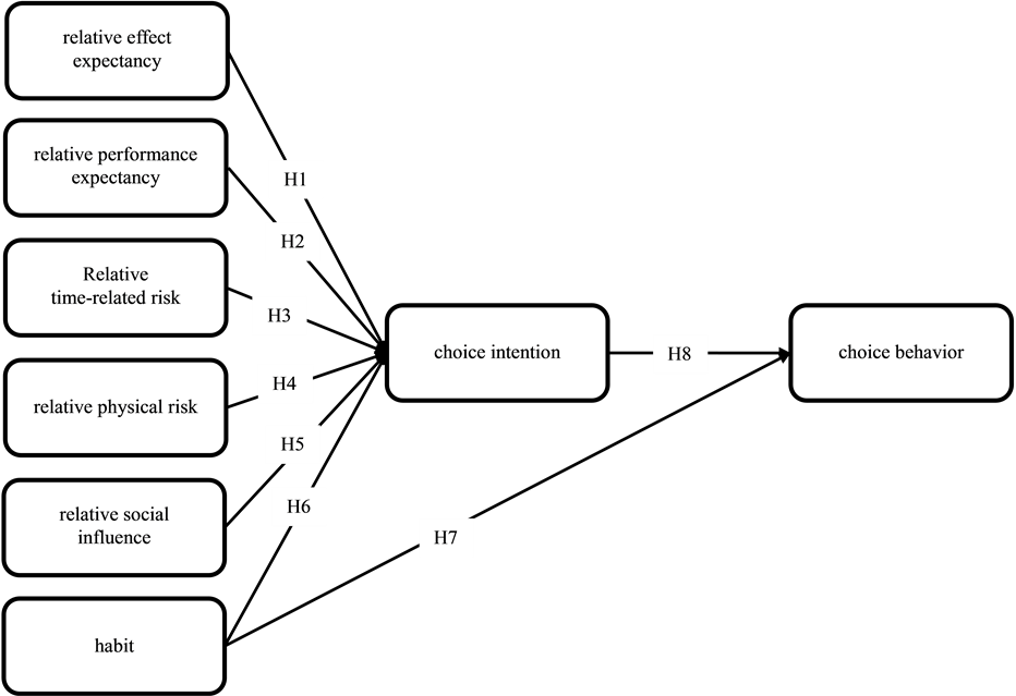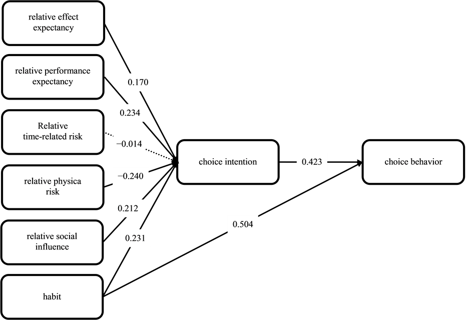 It can be seen that relative effect expectancy, relative performance expectancy, relative time-related risk, relative social influences and habit by acting on choice tendency to influence choice behavior, and relative time-related risk impact on choice behavior is not significant.