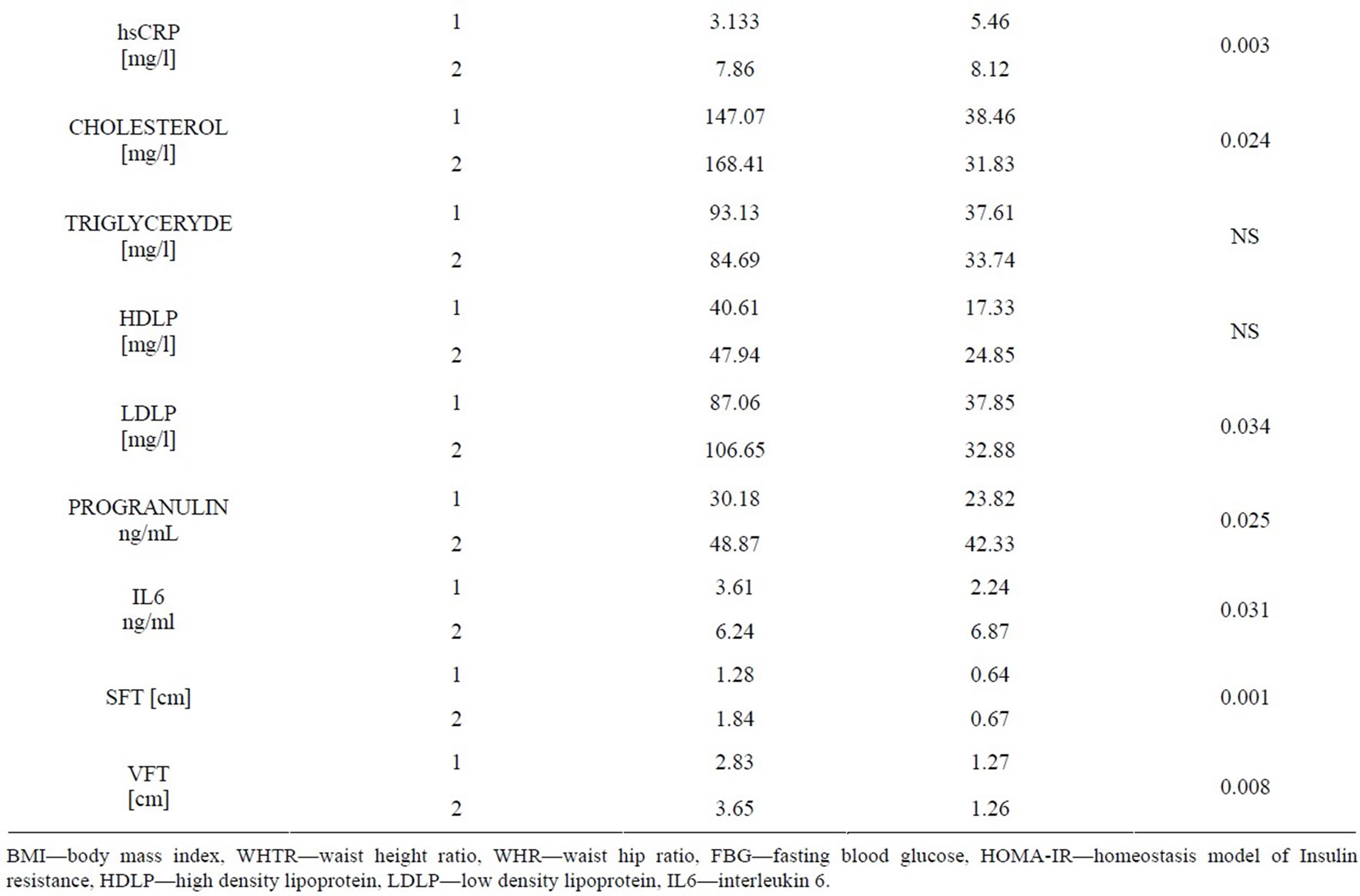 Our results of the comparative study are shown in Table 3. This revealed that there were significant differences between them as regards WHR, %body fat (P = 0.000). Serum cholesterol levels were significantly higher in obese children (168.41 ± 31.83 mg/l) than in controls (147.07 ± 38.46 mg/l), (P = 0.024). The mean serum levels of LDLP were (106.65 ± 32.88 mg/l and 87.06 ± 37.85 mg/l for obese and controls respectively, P = 0.034). Serum progranulin levels were significantly higher in obese children (79.22 ± 35.8 ng/ml) than in controls (96.82 ± 19.61 ng/ml, P < 0.002). The mean serum IL6 level in the obese group was (6.24 ± 6.87 ng/ml), which was higher than that in the non-obese group (P < 0.03), in which the mean serum IL6 level was (3.61 ± 2.24 ng/ml). Regarding the subcutaneous fat thickness (SFT), we found that there was more fat in the obese group , showing a significant difference from the control group (P-value < 0.05). Visceral fat thickness (VFT) mean levels were significantly higher in obese children (3.65 ± 1.26 cm) than in controls (2.83 ± 1.27 cm, P < 0.008).