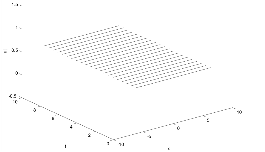 The conserved quantities and the infinity error norm are given in Table 3 and Table 4 for second and fourth order numerical schemes respectively. The results show that the two schemes solve this problem exactly and conserve the conserved quantities exactly as well. In Figure 3, we display the modulus of the numerical solution of U at