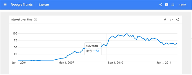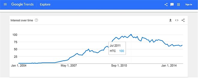 the search volume from Google Trends rose sharply from February 2010 and reached its peak in July 2011. From the high search volume, we can know a lot of people are searching what they want to know about HTC. Certainly, a large number of media reports will be produced about the company’s information, providing overwhelming references for the public.