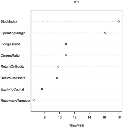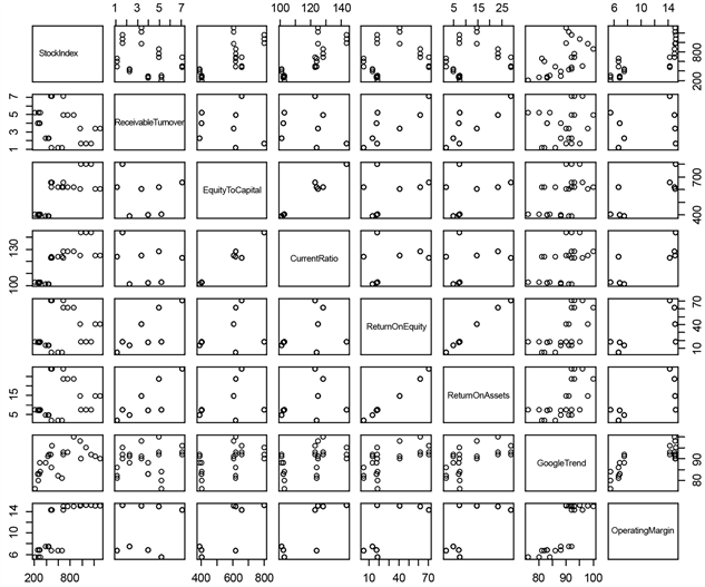 The relationships among predictors are further illustrated in Figure 2. The results showed that some relationships are linear such as Equity to Capital and Current Ratio, Return on Equity and Return on Assets; but others are nonlinear, such as Stock Index and Current Ratio, Stock Index and Operating Margin, Receivable Turnover and Return on Equity, Receivable Turnover and Return on Assets, Google Trend and Operating Margin.