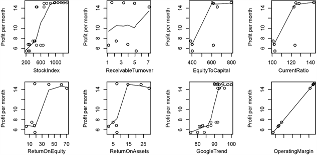 where n is the number of measurements in each of the two variables. The di is the ranked difference between the ith measurements for the two variables. The results from the correlation analysis showed that profit is strongly correlated with Operating Margin, Stock Index, and Google Trend (Table 1). There are strong correlations (ρ > 0.8) among some predictors, such as, Stock Index and Current Ratio, Stock Index and Operating Margin, Receivable Turnover and Return On Equity, Receivable Turnover and Return On Assets, Equity To Capital and Current Ratio, Return On Equity and Return On Assets, Google Trend and Operating Margin.