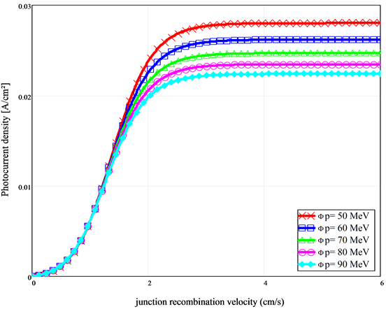 We note in this figure that the photocurrent density is almost zero for recombination velocity lower than 10 cm/s (solar cell operating in open circuit). Then for 10 cm/s < Sf < 3 × 103 cm/s, the photocurrent density increases with the recombination velocity to reach a maximum of amplitude. This shows that the excess minority carrier has acquired some energy to cross the junction.