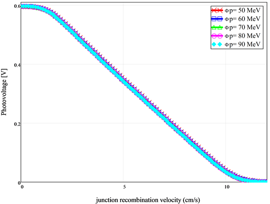 We note in this figure that the photovoltage is maximum and constant for recombination velocity lower than 2 × 102 cm/s; thus corresponding to solar in open circuit condition. Beyond this recombination velocity, the photovoltage linearly decreases very rapidly to reach almost zero value in the vicinity of the short-circuit and consequently, yields the crossing of almost all excess minority carrier at the junction.