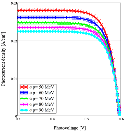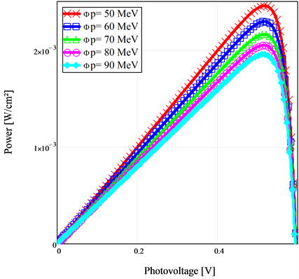 The maximum power point of a photovoltaic generator corresponds to the photocurrent density-photovoltage couple generating the maximum electrical power [17] . The product of the maximum photocurrent density Jphmax and the maximum photovoltage Vphmax gives a maximum power as Pmax = Jphmax × Vphmax.