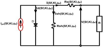Applying the first Kirchhoff law to the circuit of Figure 5 the current delivered by an illuminated solar cell to an external load, is given by the following relationship: