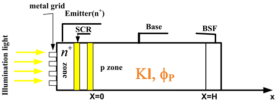 x is the depth in the base of the solar cell measured from the emitter-base junction, called space charge region (SCR) (x = 0) to the back side face (x = H). H is the base thickness, where a back surface field (BSF) is created by help of the p+ zone.