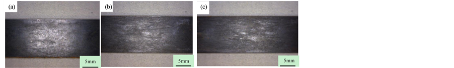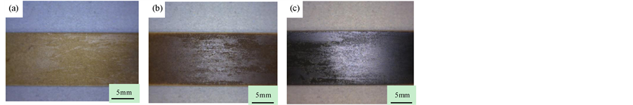 Figure 4. Photographs of surface of specimens (powder 100%). a) 160˚C; b) 180˚C and c) 200˚C.