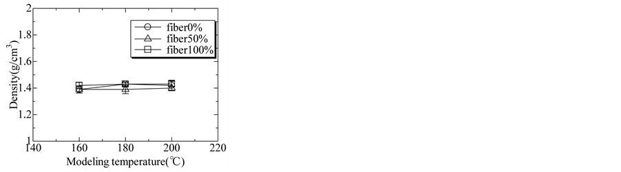The relationship between the density of the composites and molding temperature is shown in Figure 7, and shows that the density of specimens the almost same value increased with rising molding temperature. The value indicated 1.39 to 1.42 g/cm3.