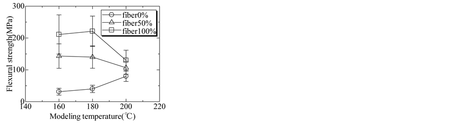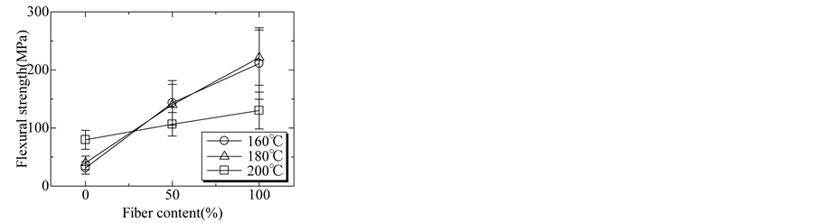 Figure 14 shows the relationship between tensile strength and fiber content. From this figure, tensile strengths increase with increasing fiber content. The tensile strengths were 169.9 MPa, in the samples with a fiber fraction of 100%. Figure 15 shows the relationship between tensile strength and molding temperature. In the case of specimen of fiber content of 100%, tensile strength decreased with increasing molding temperature. This was expected as it was known from an earlier study that the strength of natural fiber decreases at temperatures above 180˚C [12] . Therefore, it is thought that the strength of the molded specimens created from fiber bundles decreased at 200˚C. On the other side, in the case of fiber content of 0% and 50%, tensile strength increased with