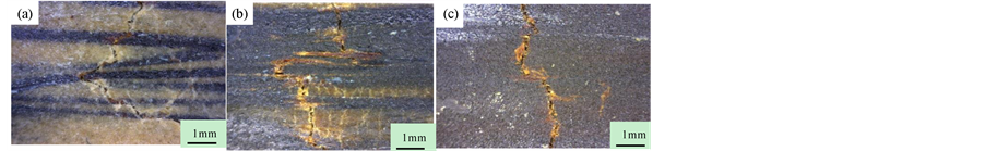 Figure 10. Fracture behavior after flexural test (powder 100% molding temperature). a) 160˚C; b) 180˚C and c) 200˚C).