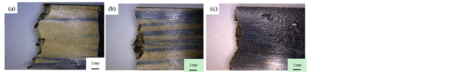 Photographs of the fabricated press molded composites using bamboo fiber of 50% and powder of 50% are shown in Figure 5, with specimens molded at 160˚C, 180˚C and 200˚C shown in Figures 5(a)-(c), respectively. As seen in these figures, the color powder and fibers of the specimen molded at 160˚C is pale yellow and brown; however, the color of powder darkened with rising molding temperature is the specimen exhibits a strong brown color at 200˚C. These results suggest that specimens browned on account of carbonization between 180˚C and 200˚C. As shown in these figures, at 160˚C, the fiber bundle and the parenchyma cell are clearly divided. On the other hand, it becomes increasingly difficult to distinguish the interface between the fiber bundle and the parenchyma cell with rising molding temperature. At 200˚C, all aspects become almost a uniform brown, making the interface between the fiber bundle and the parenchyma cell indistinguishable.