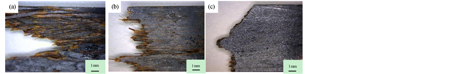 Figure 17. Fracture behavior after tensile test (fiber 100% molding temperature. a) 160˚C; b) 180˚C and c) 200˚C).