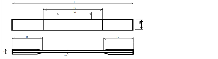 Figure 2. Shape and dimensions of tensile specimen (l = 200 mm, l0 = 50 mm, l1 = 70 mm, l2 = 65, b = 10 mm, h0 = 1 mm, h = 3 mm).