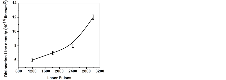 Peak intensity for the plane of brass (111) (Figure 2(a)) increases with increasing number of laser pulses up to 1800. This increase in peak intensity is ascribed to the crystal growth and atomic diffusion of host material across the grain boundaries after laser ablation [21] . Further increase in number of pulses from 2400 to 3000, the reduction in peak intensity of plane is observed. The main reason for this decrease is recrystallization phenomenon is due to laser induced melting and resolidification. After laser irradiation large sized grains disintegrate into smaller sized which result an attenuation in peak intensity of (111) plane as shown in Figure 2(a). The crystallite size deceases with increase in number of pulses up to a maximum value of 3000 and is shown in Figure 3. Laser energy deposition to the target surface generates lattice strains by interstitial diffusion of host atoms. As a result large numbers of laser induced defect are produced which cause to reduce the crystallite size. Therefore these induced defects act as a barrier in dislocation motion [22] . Figure 4 depicts that an increasing trend in dislocation line density with increasing number of laser pulses, and it represents the increase in the concentration of the