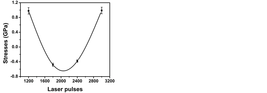 imperfections in lattice sites. The increase in the dislocation line density in the crystal lattice is due to enhanced quantification of work hardening [23] . The energy absorbed during laser material interaction is utilized not only to increase the mobility of existing dislocation defects but also to generate a great number of new dislocation defects by vibration or distortion [23] . The variation in laser induced stresses corresponding to various number of overlapping laser pulses is displayed in Figure 5. When high energy laser beam is incident on the solid target, lattice distortion and shock waves are generated. Consequently compressive and tensile stresses are produced in the irradiated brass. The high rates of heating and cooling also generate tremendous temperature gradients. This is associated with the local heating, and the plasma-dynamic flows. This is main reason for the production of residual stresses in the surface layer. The compressive stresses decrease and tensile stresses increase with increasing number of pulses [24] . These structural changes are well correlated with surface morphological modifications. SEM images of Figure 1 illustrate the formation of several kinds of features as cone, cavities and cracks. The cone formation is caused by the compressive stresses, whereas, cavities and crack formation is attributable to tensile stresses. The dislocation line density increases with increasing number of pulses up to 3000 (Figure 4) and consequently induces a high level of residual stresses in the irradiated target as observed in Figure 5 [25] .