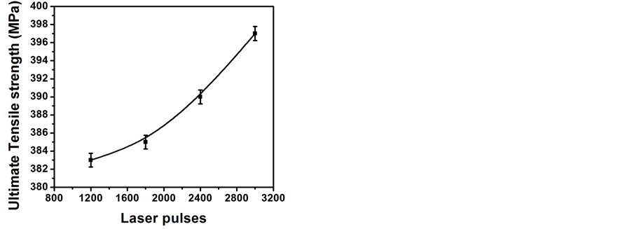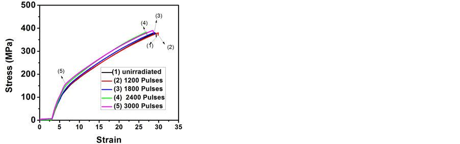 Figure 6 depicts stress-strain curves of 1) unirradiated and laser irradiated brass with a fluence of 3.4 J/cm2 in an oxygen environment for various number of overlapping laser pulses of 2) 1200, 3) 1800, 4) 2400 and 5) 3000. The variations in the Yield Stress (YS) and the Ultimate Tensile Stress (UTS) with increasing number of laser pulses are shown in Figure 7 and Figure 8, respectively. Both the YS as well as UTS exhibit monotonic increase with increasing number of pulses. The laser induced defects, stresses and strain fields are possible reason for increasing behavior of YS and UTS with increasing number of pulses. These variations in the value of mechanical properties (YS and UTS) of brass are possibly attributed to the alterations in microstructure and dislocation density which is produced by laser beam-material interaction. As strengthening mechanism is directly proportional to the number of laser induced defects [26] . The impact of high energy photons of laser radiation creates initial displacement damage in the form of primary knock out atoms (PKA) which displace nearby atoms from their equilibrium position. The total numbers of displaced atoms in a cascade depends upon number of pulses, absorbed radiation energy, temperature and nature of target materials [27] . The generation of vacancies and interstitials, and/or their clusters, act as barriers to the glide dislocations. As the incident number of laser pulses increases, the defect density also increases. The increased in number of defects acts as strong pinning points for movement of dislocation plane. Hence dislocation movement reduces which causes improvement of the mechanical properties. For that reason greater mechanical stress will be necessary to start the plastic deformation [28] .
