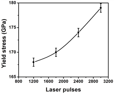 Figure 7. The variation of Yield Stress (YS) of excimer laser irradiated brass for various numbers of pulses of 1200, 1800, 2400 and 3000.