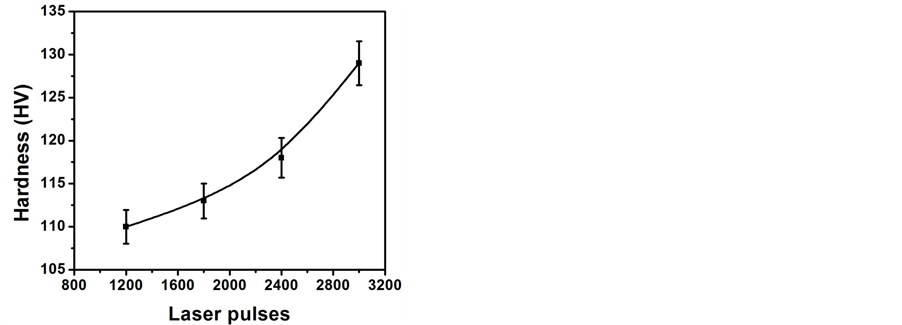 Figure 9 shows the variation in the microhardness with increasing number of laser pulses. This graph also