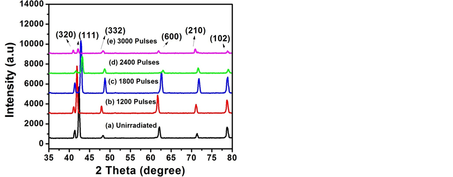 XRD technique is employed to attain phase identification, the variation in crystallinity, dislocation densities and residual stresses in the target material. Figure 2 shows the XRD patterns of unirradiated and laser irradiated brass targets. Figure 3 shows the variation in crystallite size with increasing number of laser pulses. Figure 4 shows a plot of variation of dislocation line density as a function of laser pulses. Untreated sample shows the presence of (320), (111), (332), (600), (210) and (102) planes reflection at angles of 41.7˚, 42.6˚, 48.59˚, 62.46˚, 71.62˚, and 78.03˚ [19] respectively. It is also observed that d-spacing, peak intensity and the values of full width at half maximum (FWHM) changes after laser irradiation whereas no change in the phase is found. The absorption of non-uniform conduction of the energy by atoms, recrystallization, non-uniform thermal stresses,