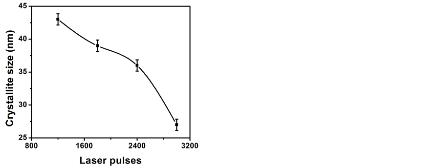 The variation in the peak intensities and d-spacing for various laser pulses under oxygen background is demonstrated in Figure 2. The difference in the peak intensity is related to the variation in the crystallite size and laser induced strain on the target surface after laser irradiation. The change in d-spacing causes variation in residual stresses and lattice distortion. The differences in inter atomic distances, thermal expansion coefficients, heating and cooling conditions between the surface layers and interstitial diffusion can be a possible cause to produce lattice distortions in lattice planes [20] .